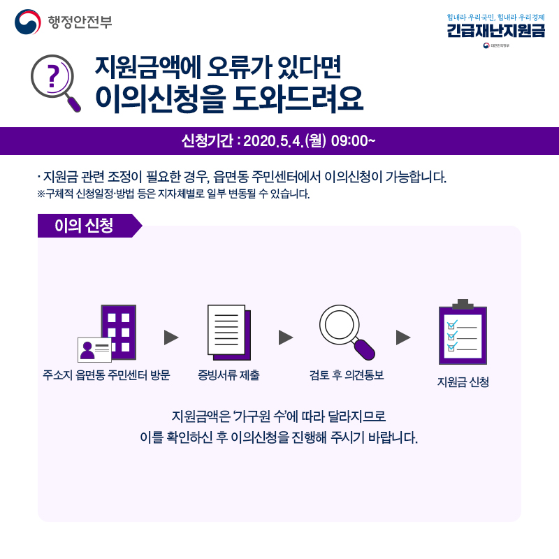 5월 4일부터는 기초생활대상, 저소득으로 생계에 직접 영향을 받는 국민 대상이며