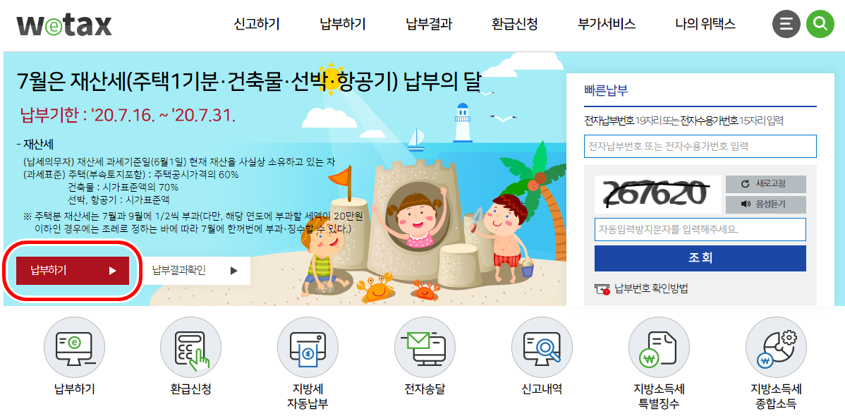 7월은 재산세 납부의 달이기에 위택스 메인화면에 재산세 납부 안내가 되어있습니다.