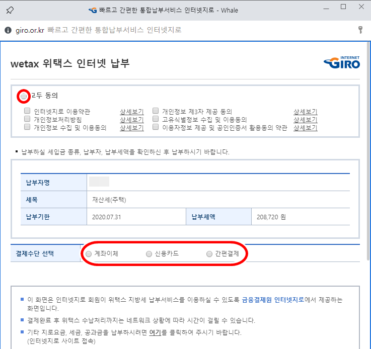 인터넷 납부를 하기 위해서는 모두 동의를 클릭하시구요