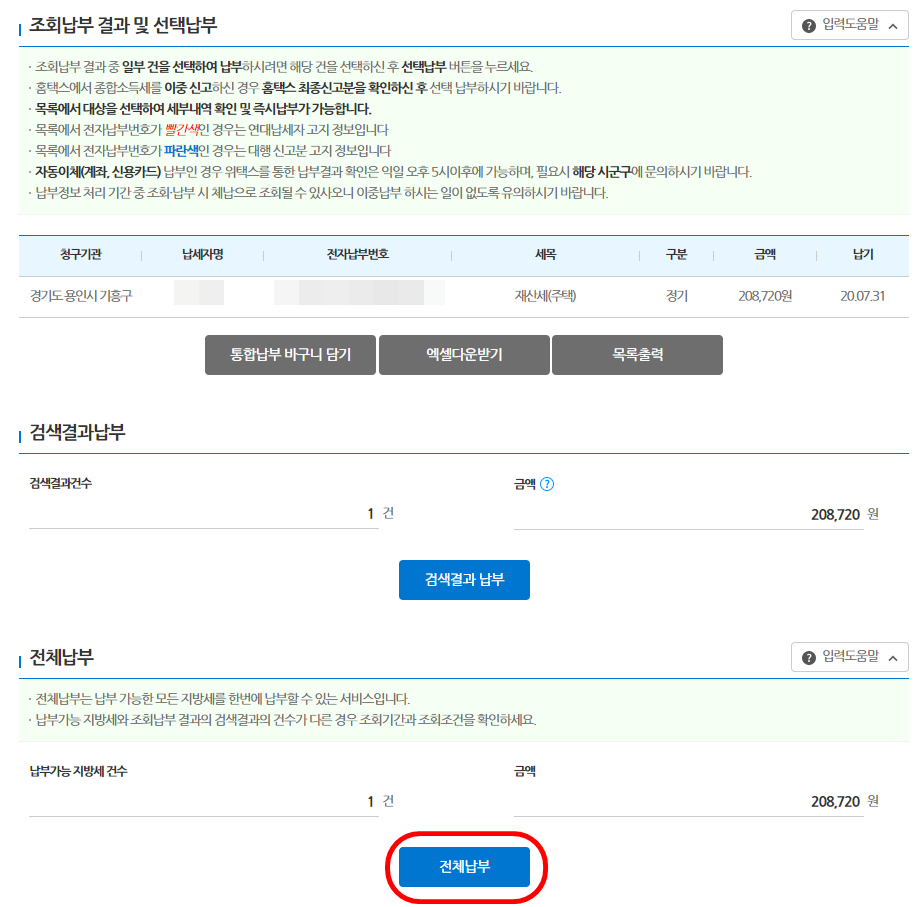 1건이라서 검색결과납부 또는 전체납부 동일합니다.