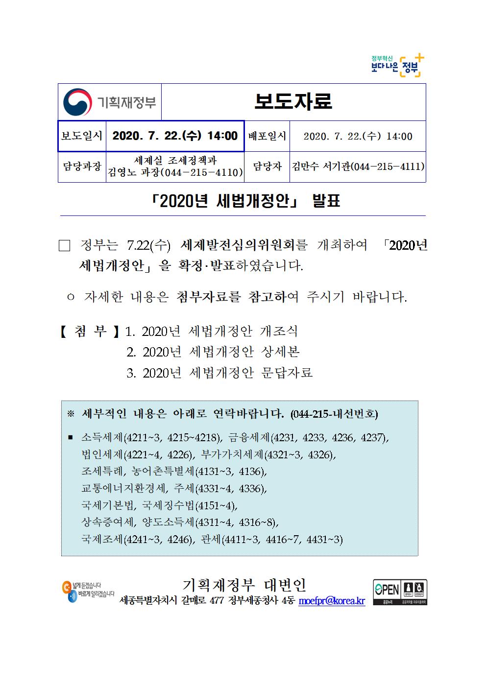 금일 기획재정부에서 2020년 세법개정안을 발표하였습니다.