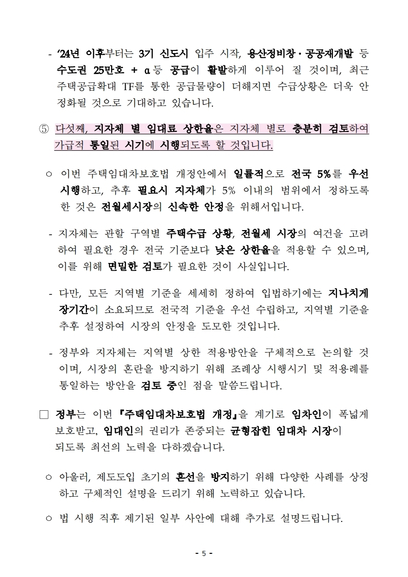 ⑤ 다섯째, 지자체 별 임대료 상한율은 지자체 별로 충분히 검토하여 가급적 통일된 시기에 시행되도록 할 것입니다.
