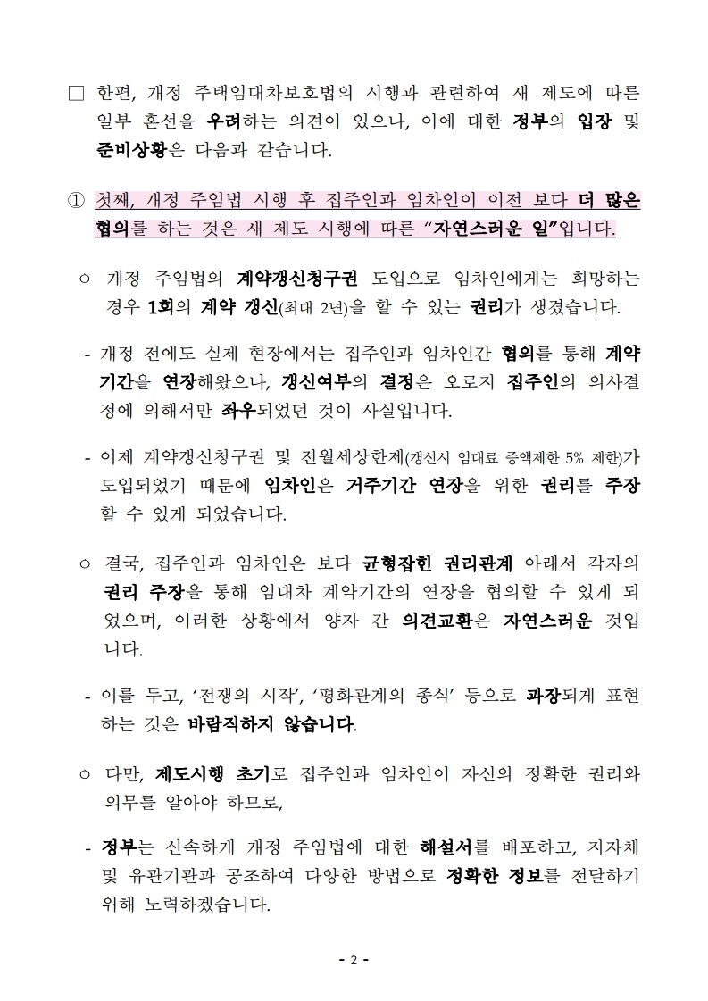 한편, 개정 주택임대차보호법의 시행과 관련하여 새 제도에 따른 일부 혼선을 우려하는 의견이 있으나, 이에 대한 정부의 입장 및 준비상황은 다음과 같습니다.