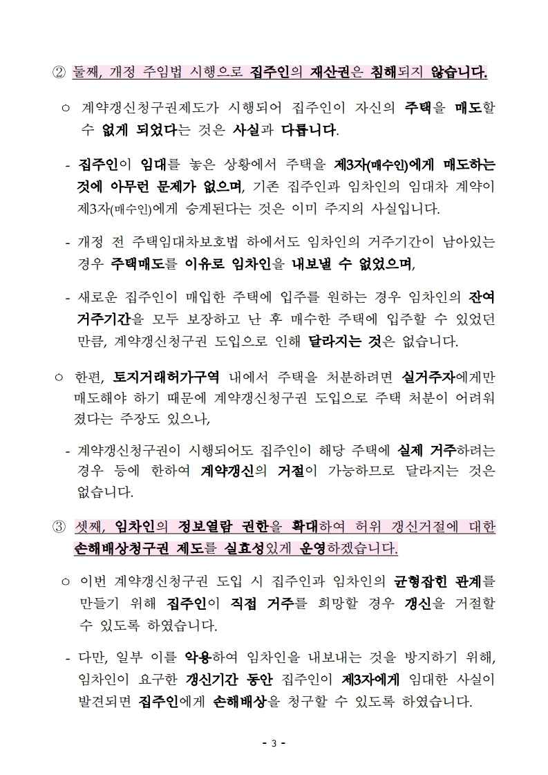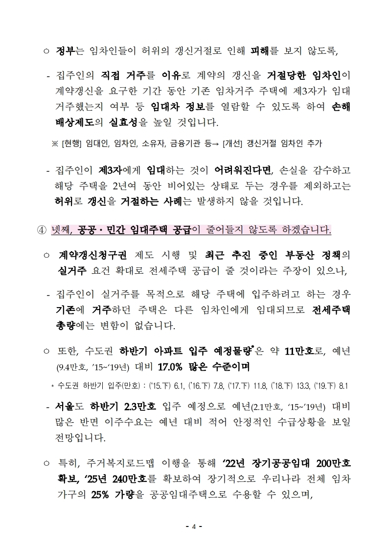 정부는 이번 「주택임대차보호법 개정」을 계기로 임차인이 폭넓게 보호받고, 임대인의 권리가 존중되는 균형잡힌 임대차 시장이 되도록 최선의 노력을 다하겠습니다.