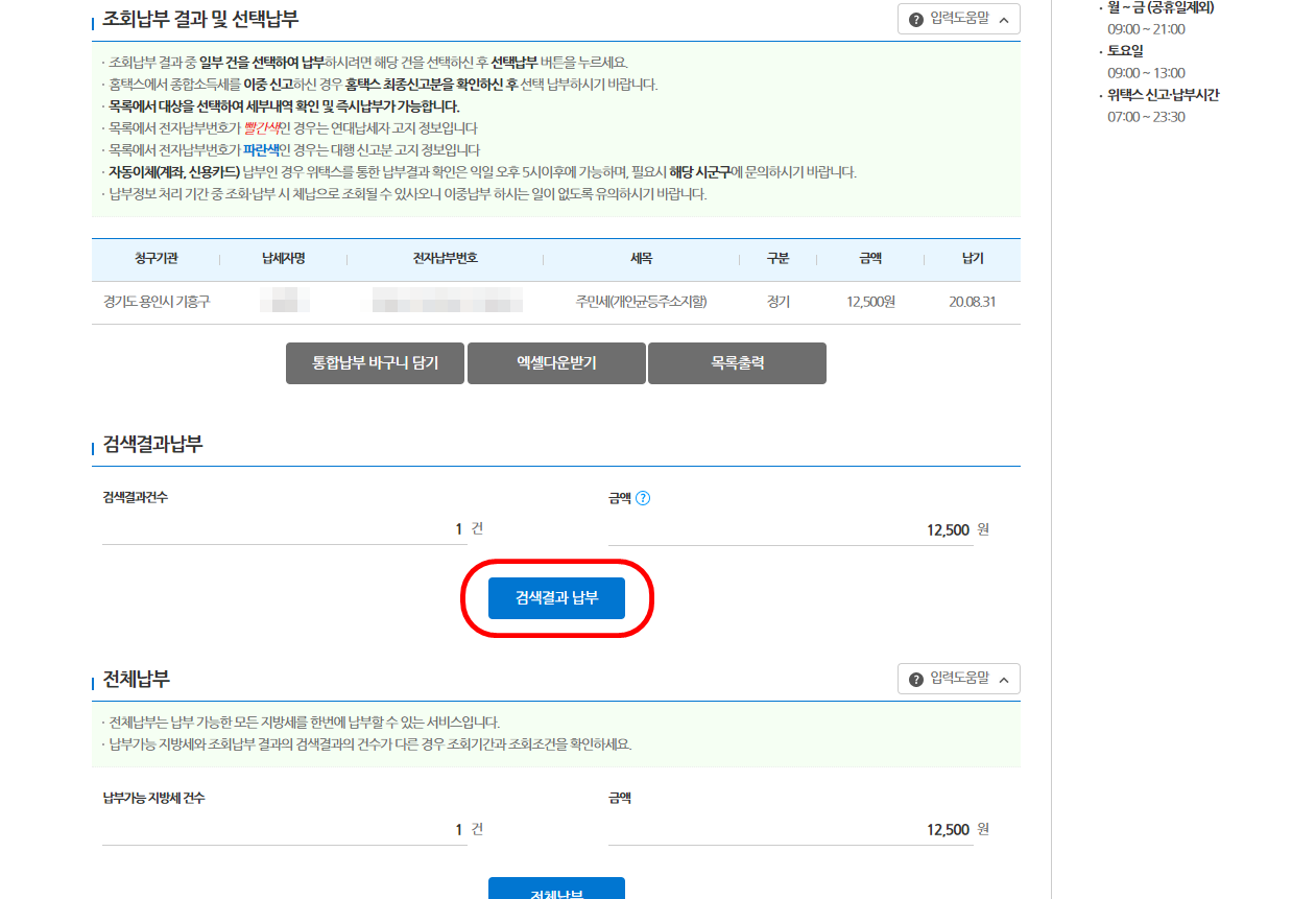 저는 1건이라 검색결과 납부를 진행하였구요. 하단의 전체납부를 하셔도 됩니다.