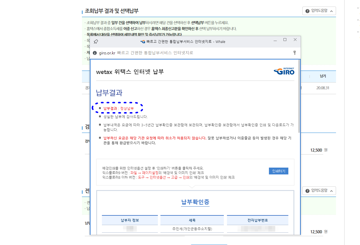 납부가 완료되면 정상납부로 표기되며, 납부 확인증을 볼수 있습니다.