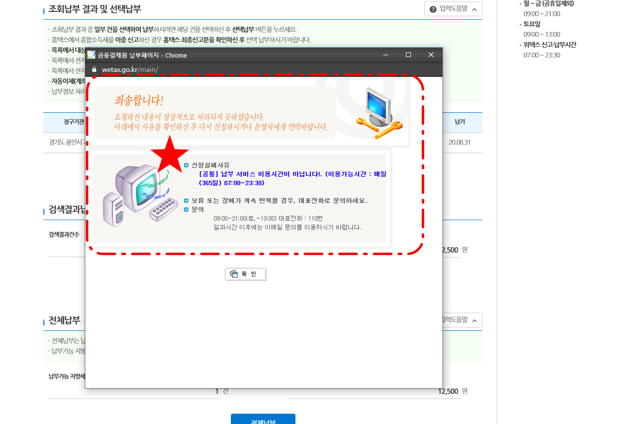 저는 23:45분에 납부하려했는데 아래와 같이 안내가 나와서