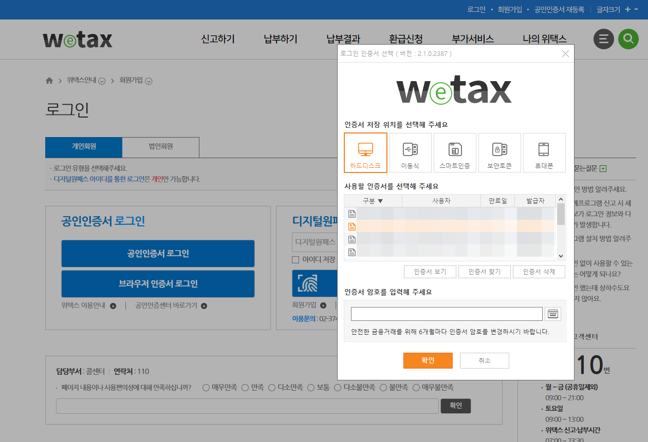 공인인증서, 브라우저 인증서 편한 방식으로 선택하여 로그인을 진행합니다.