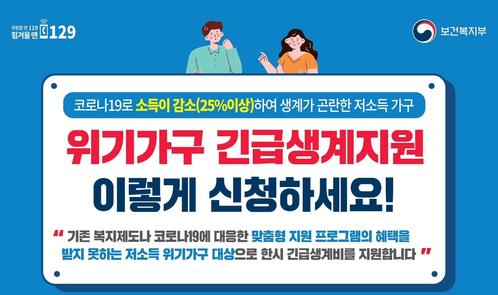 - 코로나19로 인한 실직·휴폐업 등 가구 소득감소(25%이상)로 생계가 곤란한 저소득 위기가구