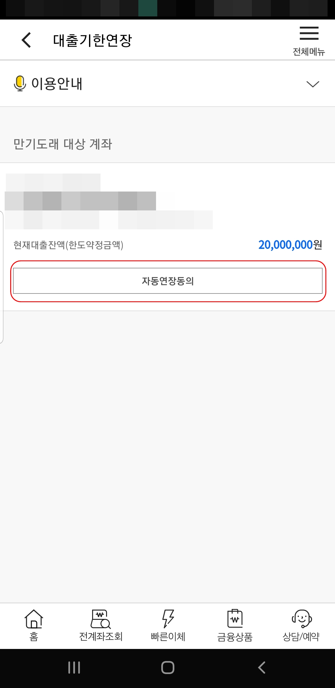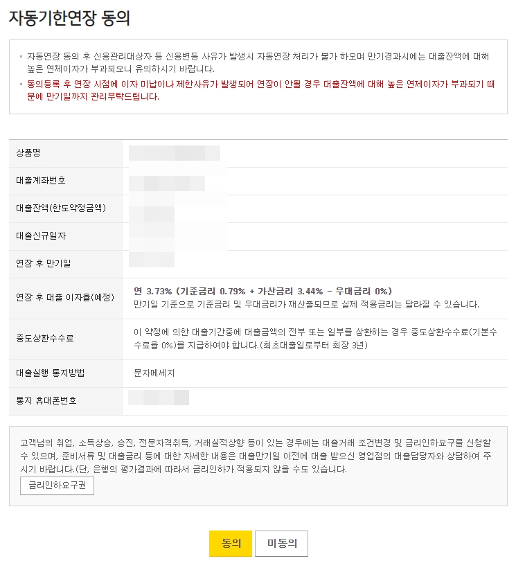 대출기한연장에서 대상 계좌를 확인후 자동연장동의를 클릭합니다.
