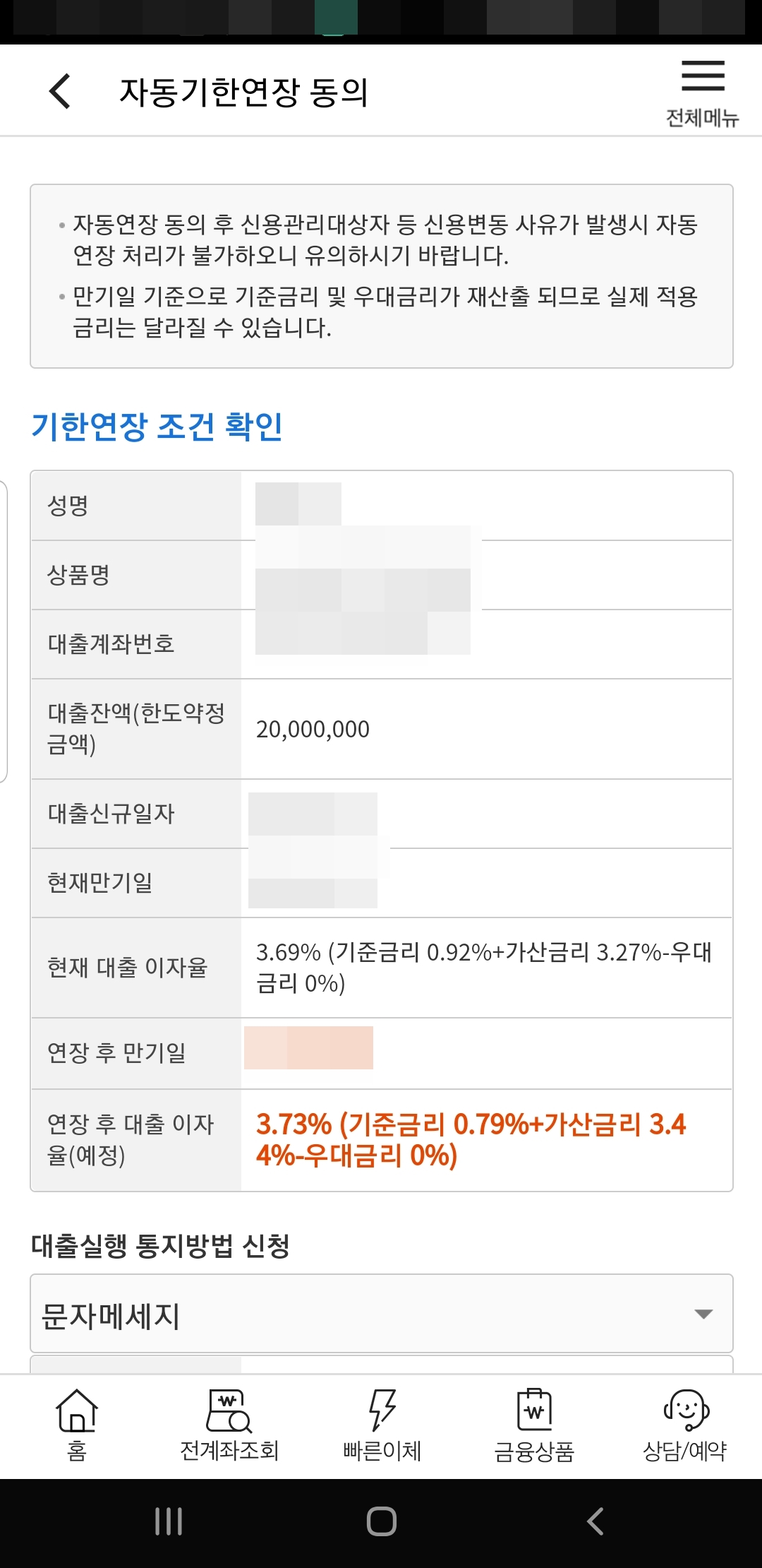 현재 대출 적용금리와 예정금리를 확인할수 있으며