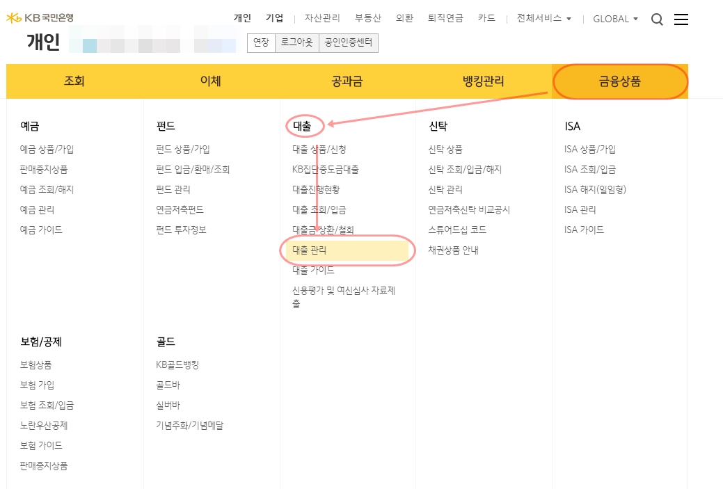 KB인터넷뱅킹 로그인 → 금융상품 > 대출 > 대출관리 > 대출기한 연장