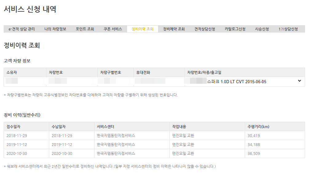 점검 내역을 살펴보면 1년마다 엔진오일 교환을 진행하였네요