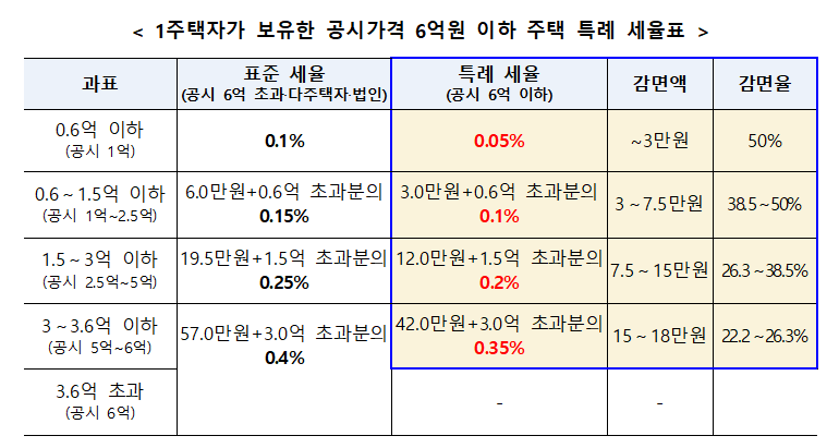 공시가격 6억원 이하 과세표준 구간별 세율 0.05%p 인하