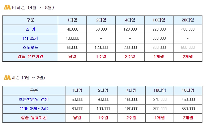 가격이 궁금하신 분을 위하여... 미필 스키랜드에 안내된 요금을 가져왔습니다.