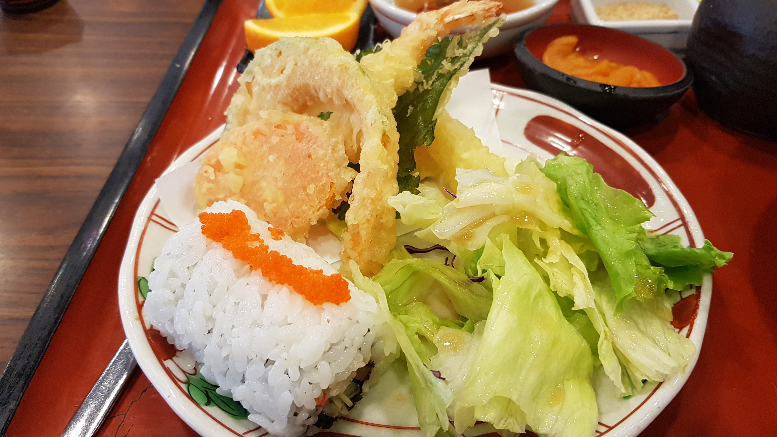 새우튀김 2개, 당근튀김, 고구마튀김, 호박튀김, 깻잎튀김 1개씩이며, 샐러드와 롤초밥 4개입니다.