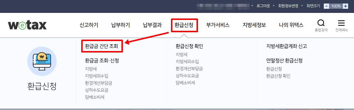 환급신청 - 환급금 간단조회를 클릭하여 들어갑니다.