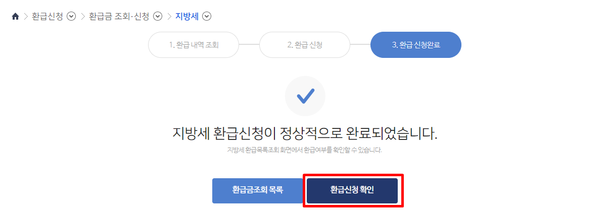 아래와 같이 "지방세 환급신청이 정상적으로 완료되었습니다." 를 보시면 끝나셨습니다.