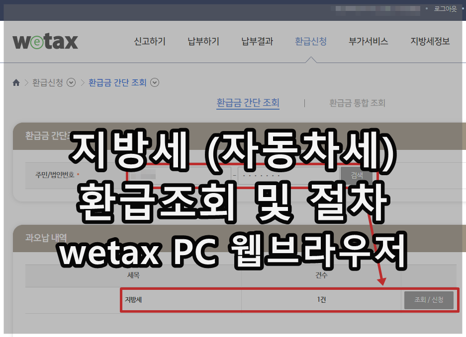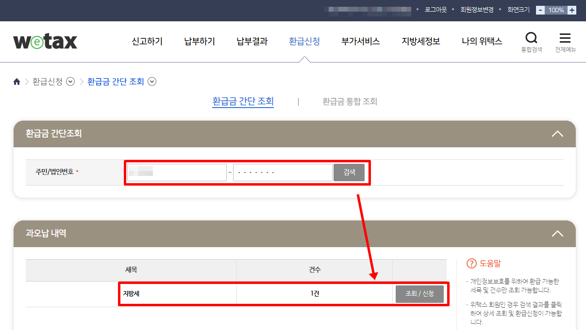 환급 대상이 있을경우 조회/신청을 통해서 관할자치단체 세목명 환금대상액을 확인이 가능합니다.