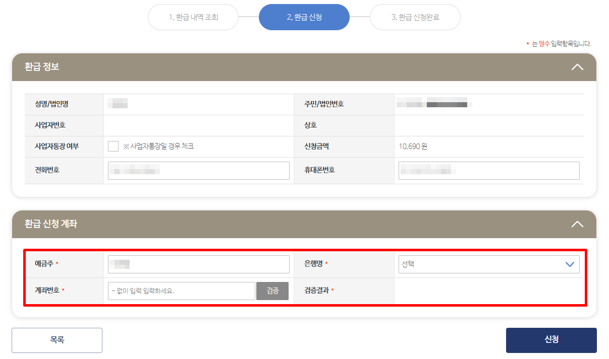 환급받고자하는 통장 계좌번호만 입력하면 환급신청은 완료되며