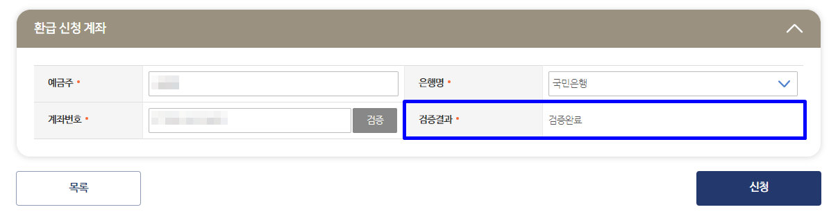 반드시 은행명과 계좌번호 입력후 검증결과에 "검증완료"로 표기되어야합니다.