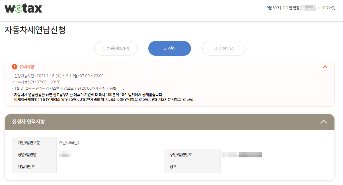 위 내용 확인후 신청을 누르면 자동차세 연납신청은 완료됩니다.