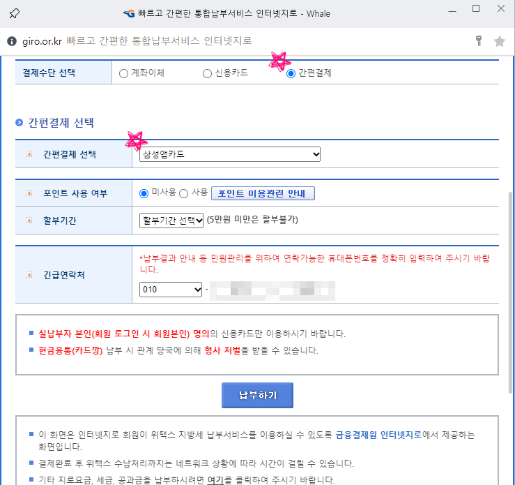 삼성페이로 진행하실분은 작년에 포스팅한 내용 참고하시면 되겠습니다.