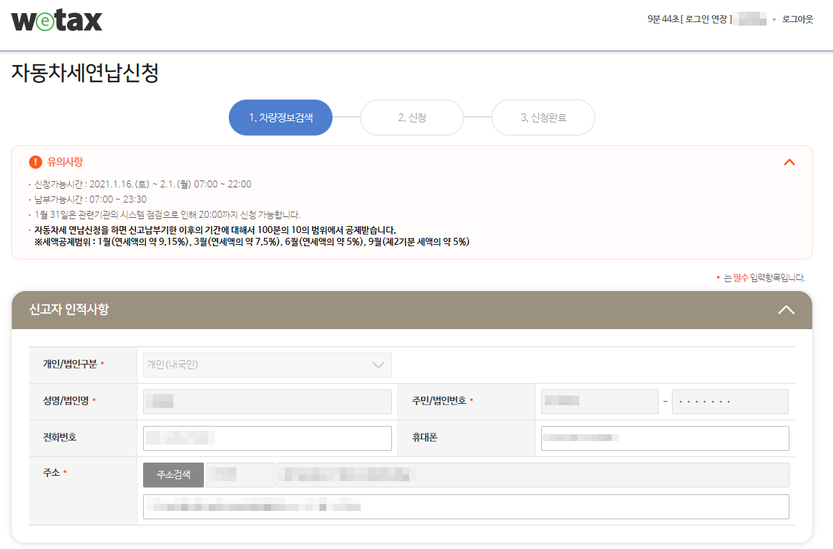 자동차세 연납신청시간은 07시부터 22시입니다.