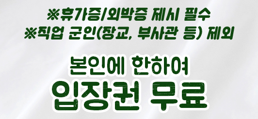 - 입장권 : 사병군인인 경우 무료, 인근주민(동단위) 10,000원