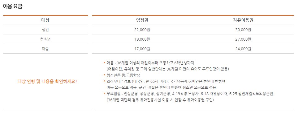 성인기준 자유이용권 30,000원, 입장권 22,000원