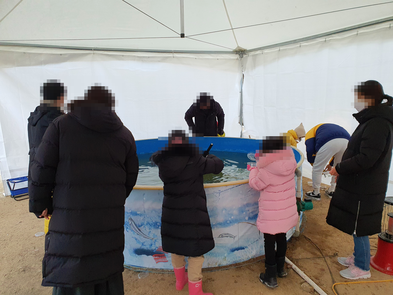 얼어붙은 호수에서 얼음썰매와 빙어낚시 축제가 한창입니다.