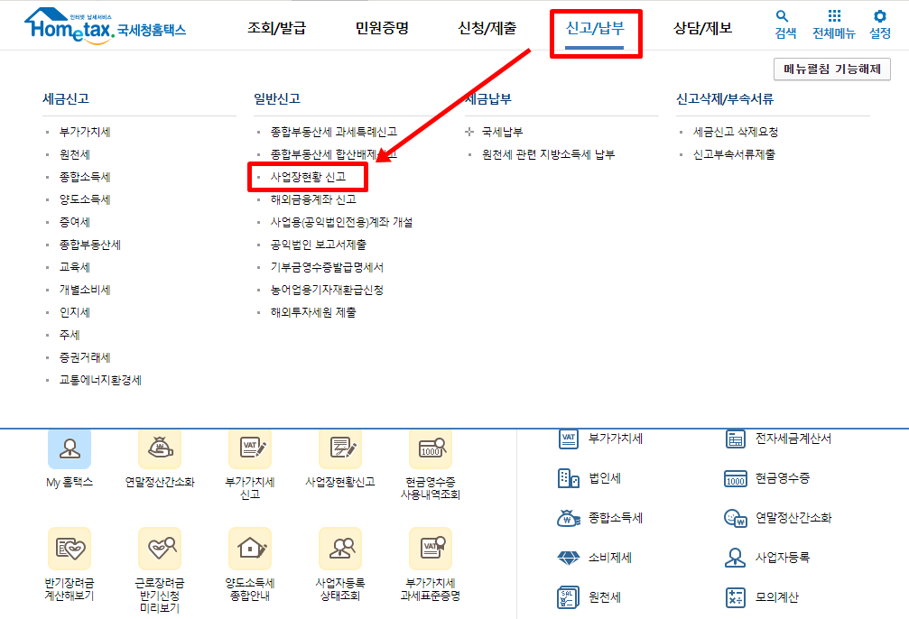 1) 메인페이지 사업장 현황신고 안내 클릭