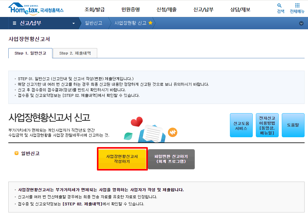 화면 중앙에 '사업장 현황신고서 작성하기'를 클릭합니다.