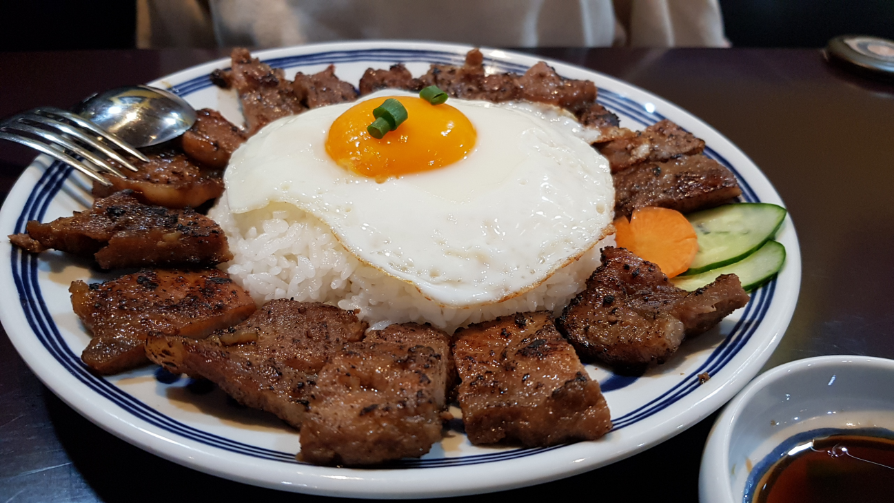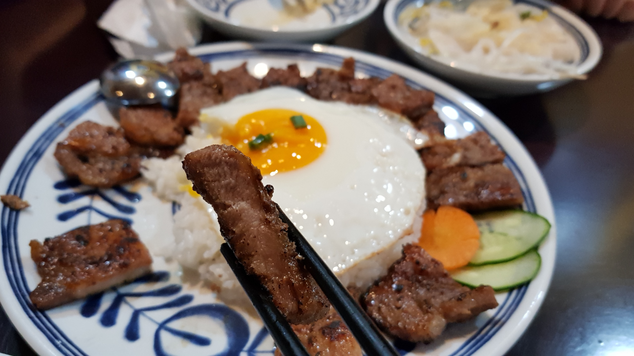 숯불에 익힌 고기와 써니싸이드 계란, 그리고 밥