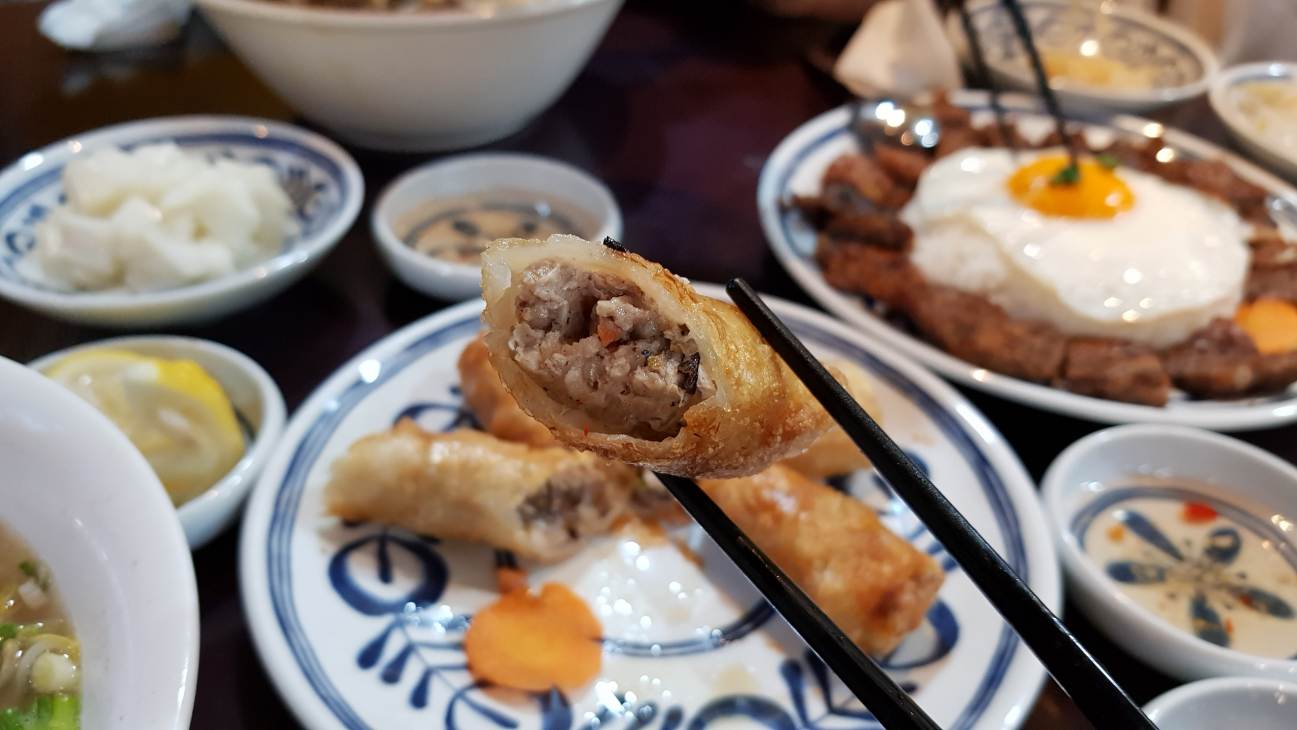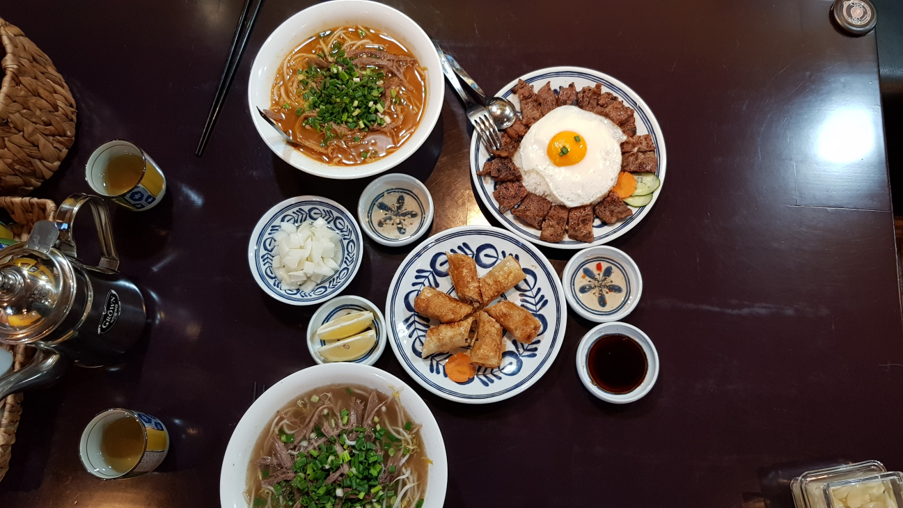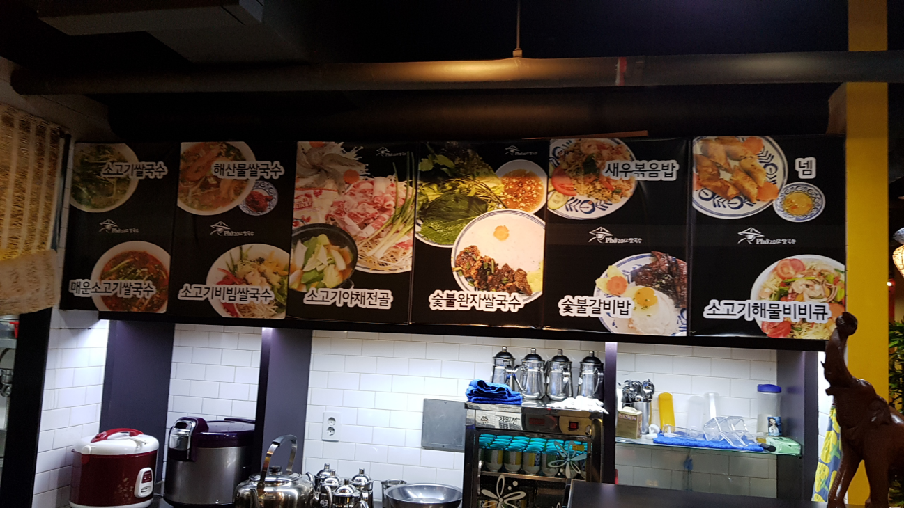 소고기 쌀국수, 매운쌀국수, 숯불갈비밥, 튀김만두(넴)