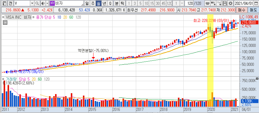 작년 코로나로 213$의 주가가 133$까지 40%가까이 폭락했지만