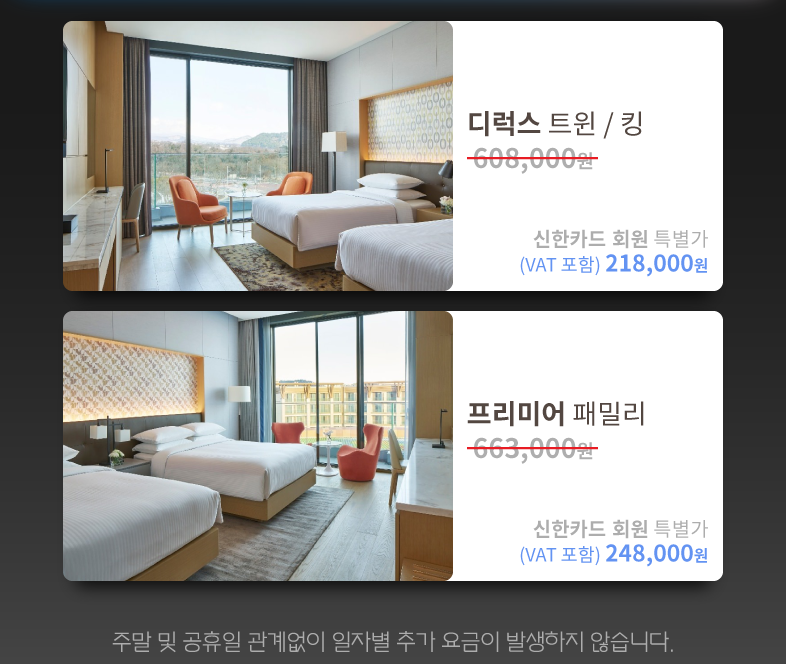 객실 비용은 신한카드로 결제 시에만 본 특별 가격이 적용 됩니다. (신한카드로 결제 불가 시, 객실 정가 청구)