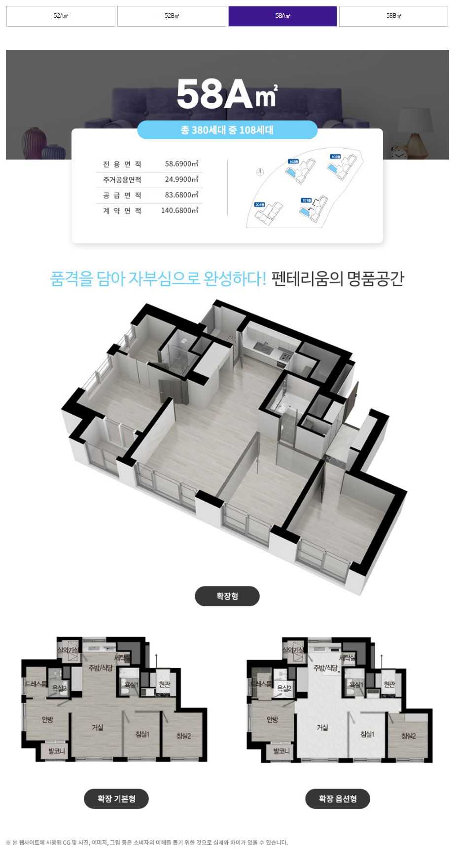 동탄 금강펜테리움 더시글로 세대평면도 58A타입 108세대
