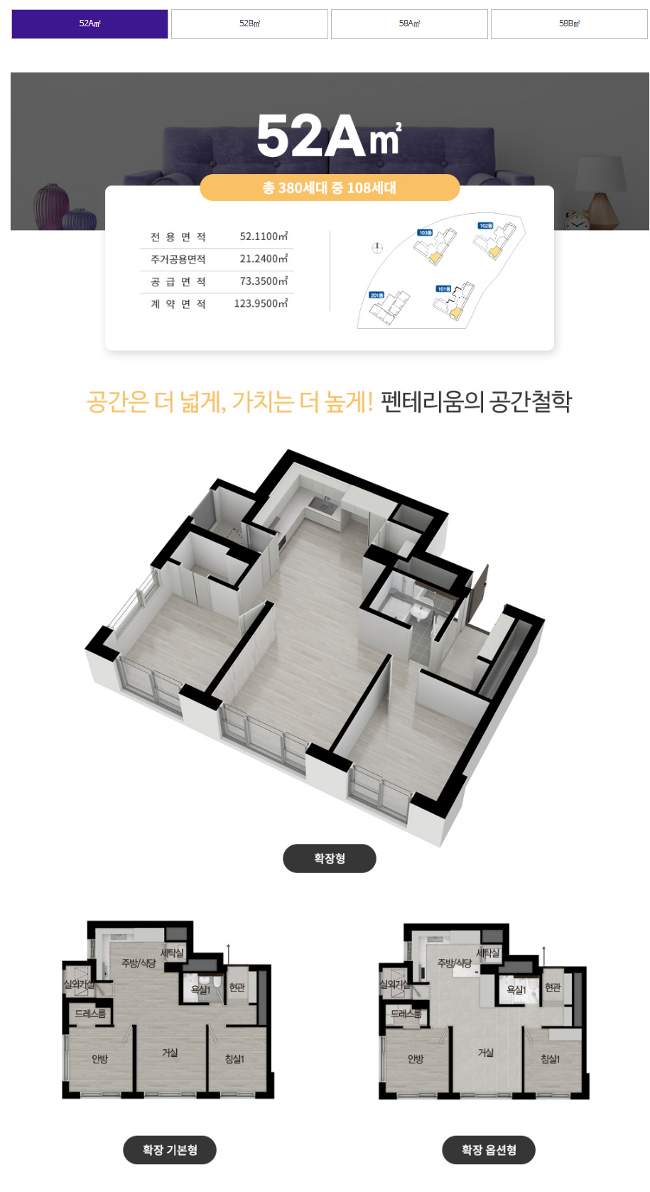 동탄 금강펜테리움 더시글로 세대평면도 52A타입 108세대