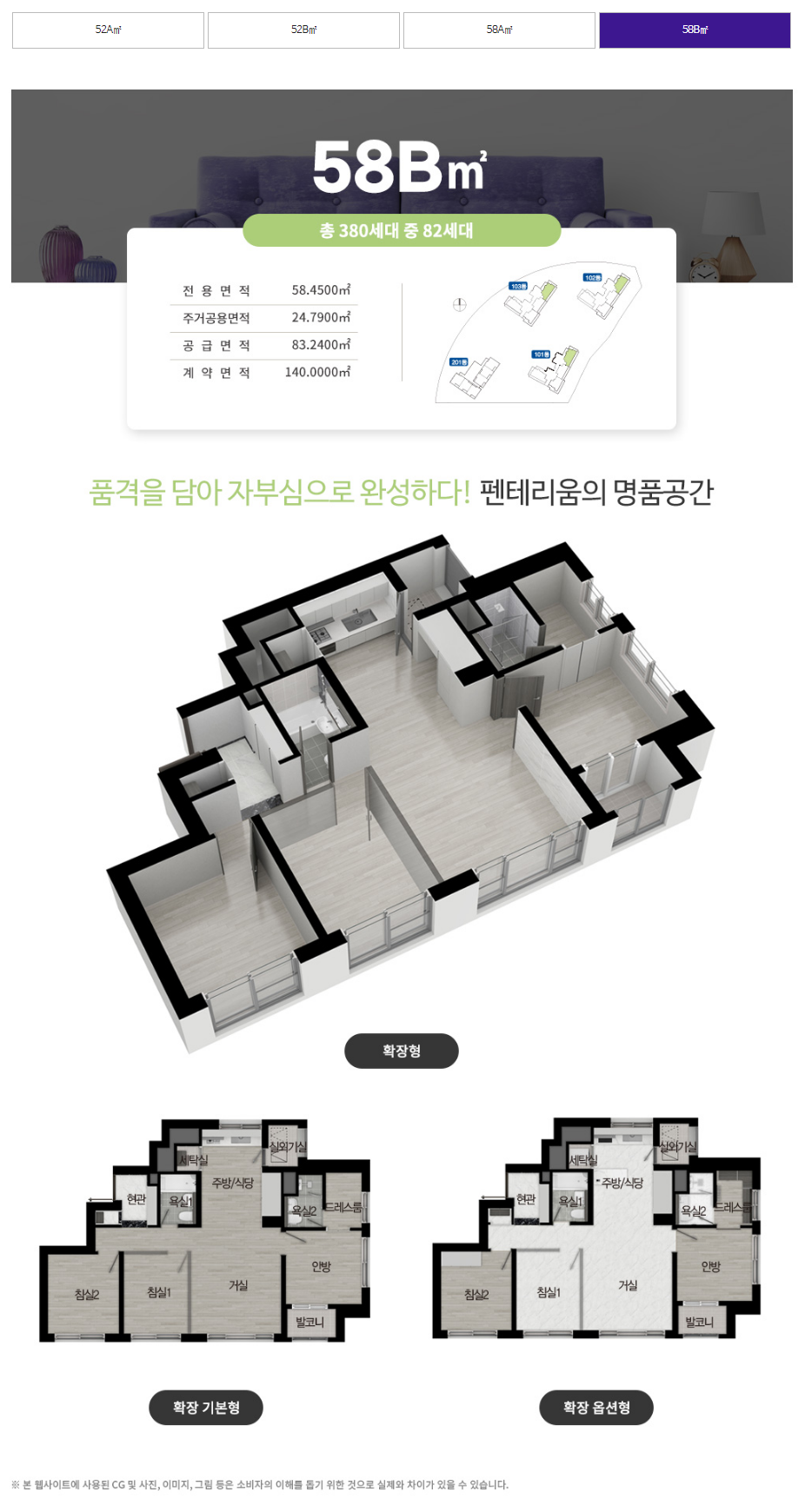 아쉽게도 디에트르에 비해 작은 평형 52타입 (22평), 58타입 (24평)만 있습니다.