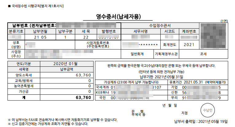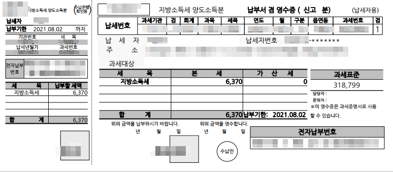 국세 63,760원 (20%), 지방세 6,370원 (2%)의 양도소득세 납부 완료 포스팅입니다.