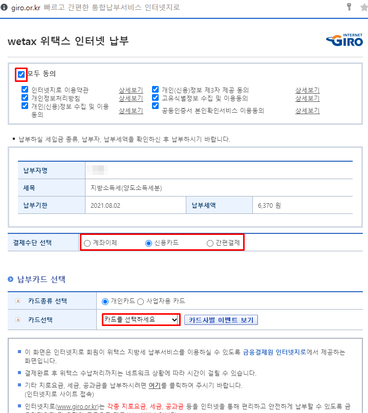 그리고 카드 납부시 반드시 본인 명의의 신용카드로만 납부가 가능합니다.