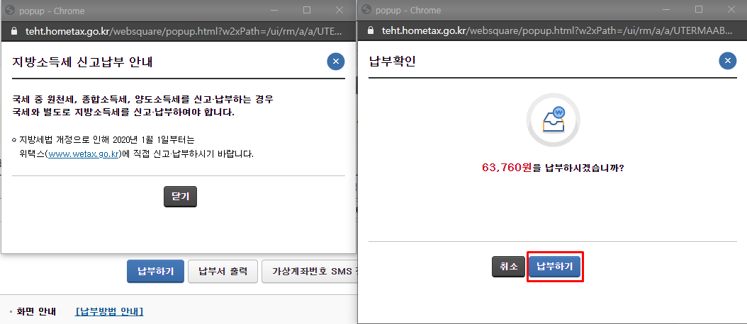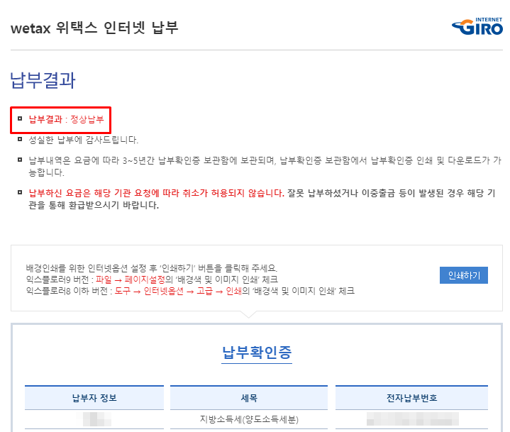 결제 승인이 이뤄지고 나면 아래와 같이 납부결과 정상납부 안내가 표기됩니다.