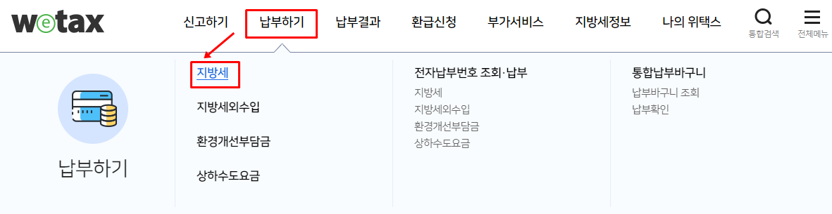 지방소득세 : 위택스 www.wetax.go.kr 로그인→납부하기→지방세→조회→납부