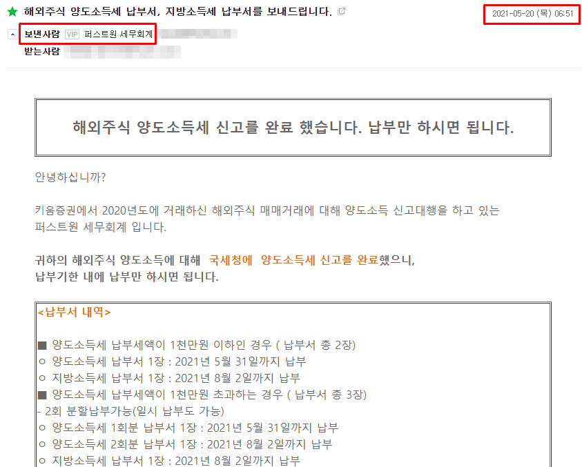 그리고 오늘 퍼스트원 세무회계 (키움증권의 신고대행 세무회계)에서 메일을 받았어요