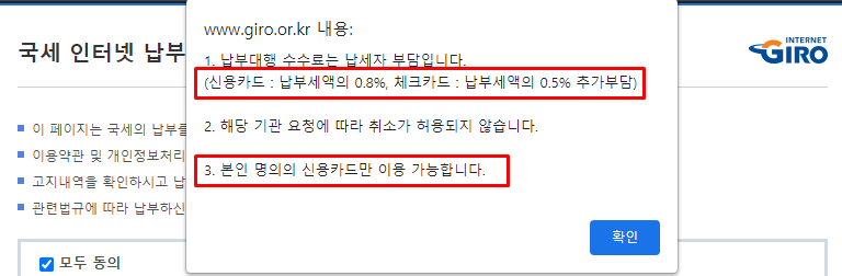 (신용카드 : 납부세액 0.8%, 체크카드 : 납부세액 0.5% 추가부담)