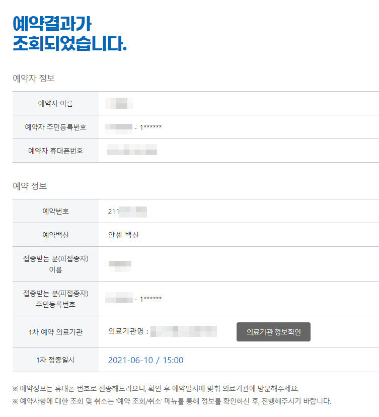 코로나 백신 접종 예약 완료 결과