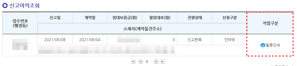 신고된 임대차 계약에 대하여 필증인쇄를 클릭하면