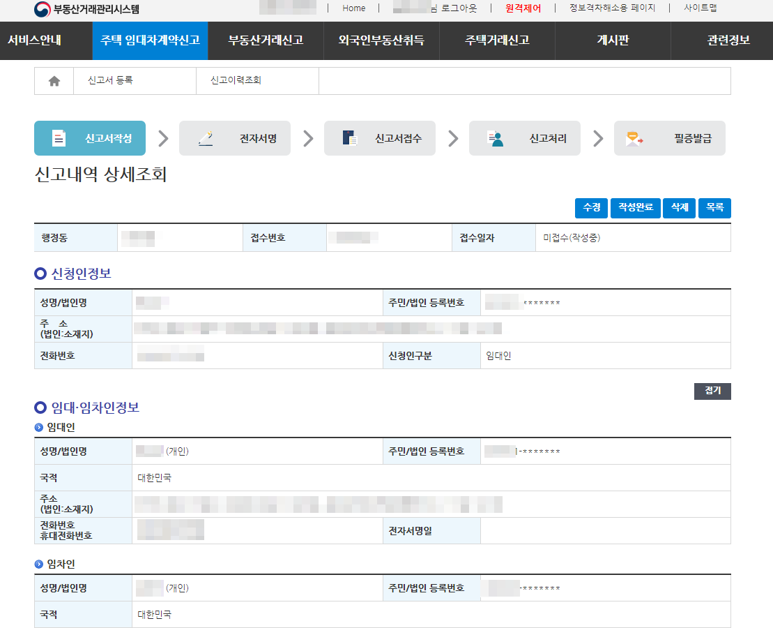 신고서등록 - 임대인/임차인/임대목적물/계약내용 입력