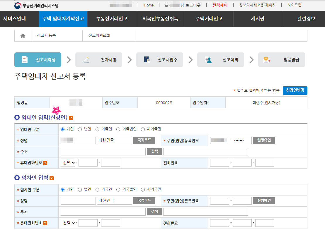 저는 임대인으로 선택하여 "임대인입력(신청인)" 으로 표기되어있으며